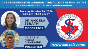 CAS and the Perioperative Section are pleased to invite you to a webinar on October 24, 2023, to address the role of resuscitative transesophageal echocardiography (TEE). Throughout the session, the presenter will highlight the importance of resuscitative TEE as an innovative form of point of care ultrasound that is especially relevant in the perioperative period.